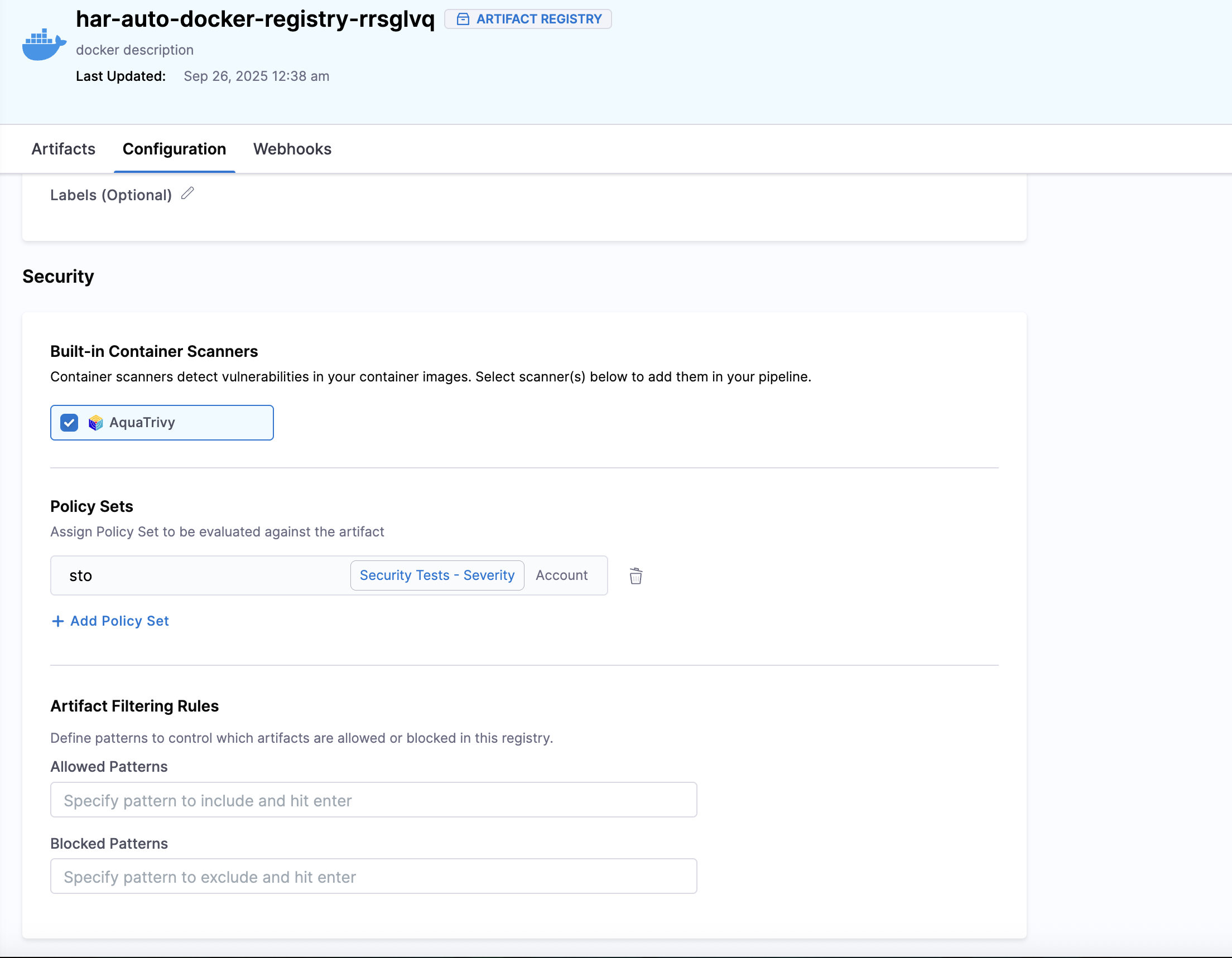 In Allowed Patterns, use a regex string to define which artifacts will be allowed into the registry. The regex will match against each incoming artifact and, if the match is successful, allow the push operation.