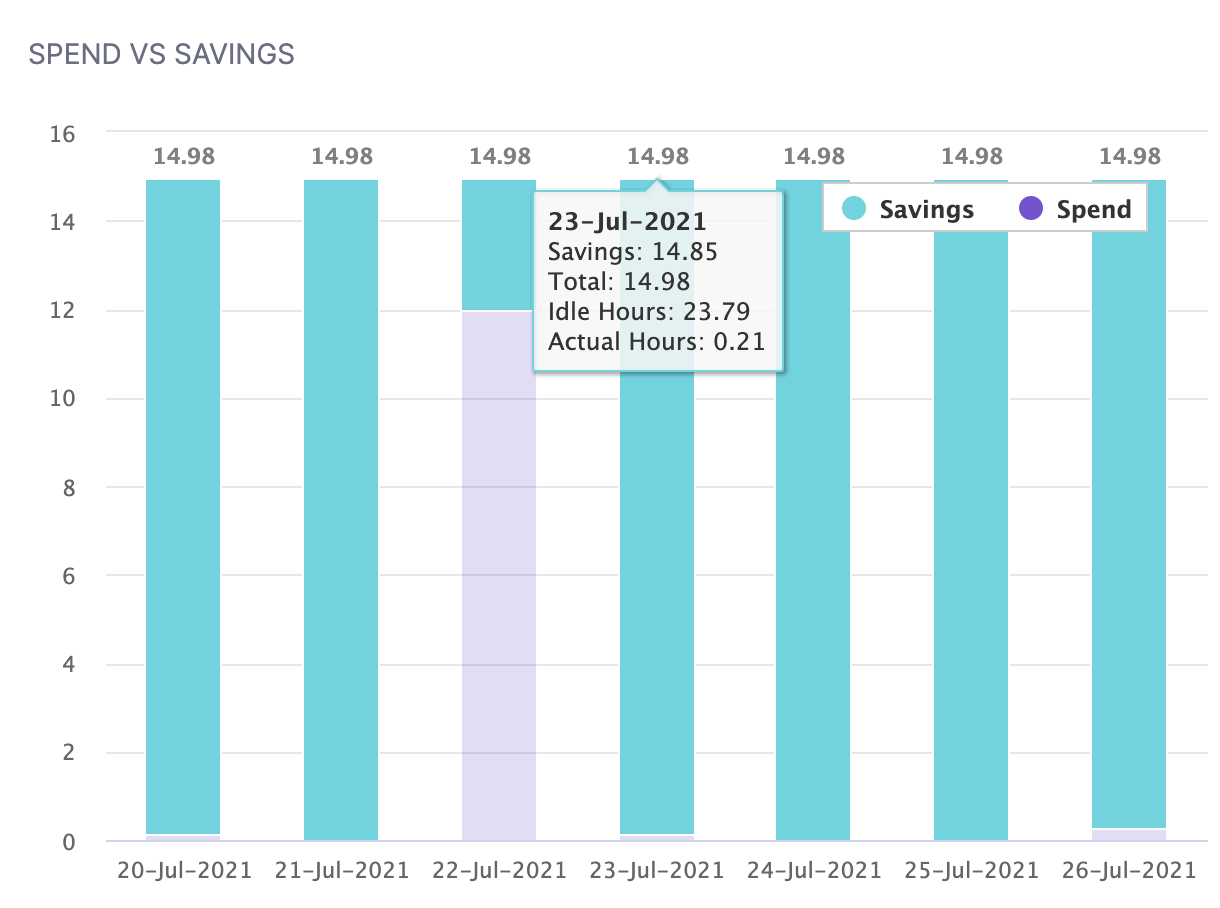 1. In Spend vs Saving, view the spend and savings data of seven days for the selected rule. The savings are calculated as the following: