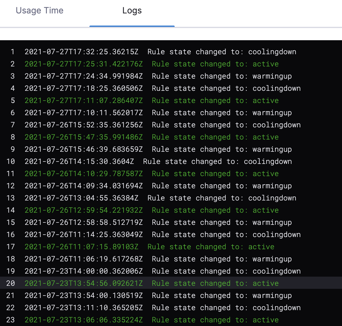 2. Logs: This shows the different states of the rule with the timestamp. For example, active, warming up, and cooling down.