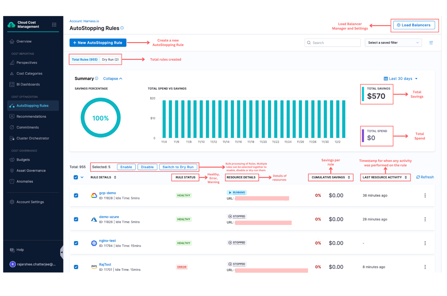 CCM now allows bulk processing of AutoStopping rules i.e. multiple rules can be selected at once to be disabled, enabled, and dry run.