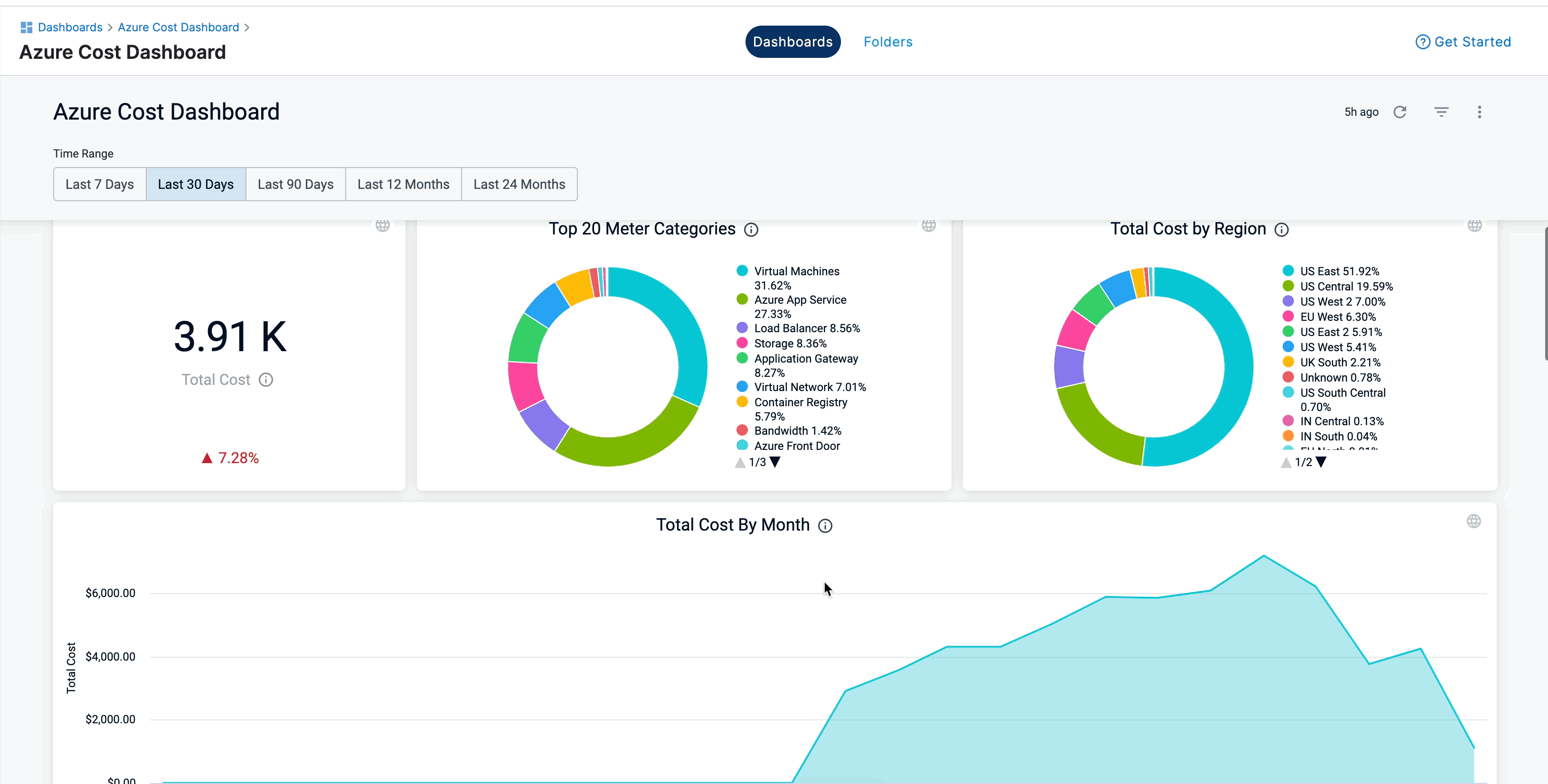 Harness provides preloaded By Harness (pre-defined) and Custom (user-defined) Dashboards to visualize cloud cost data across clusters and cloud accounts. Using the Azure Cost Dashboard you can: