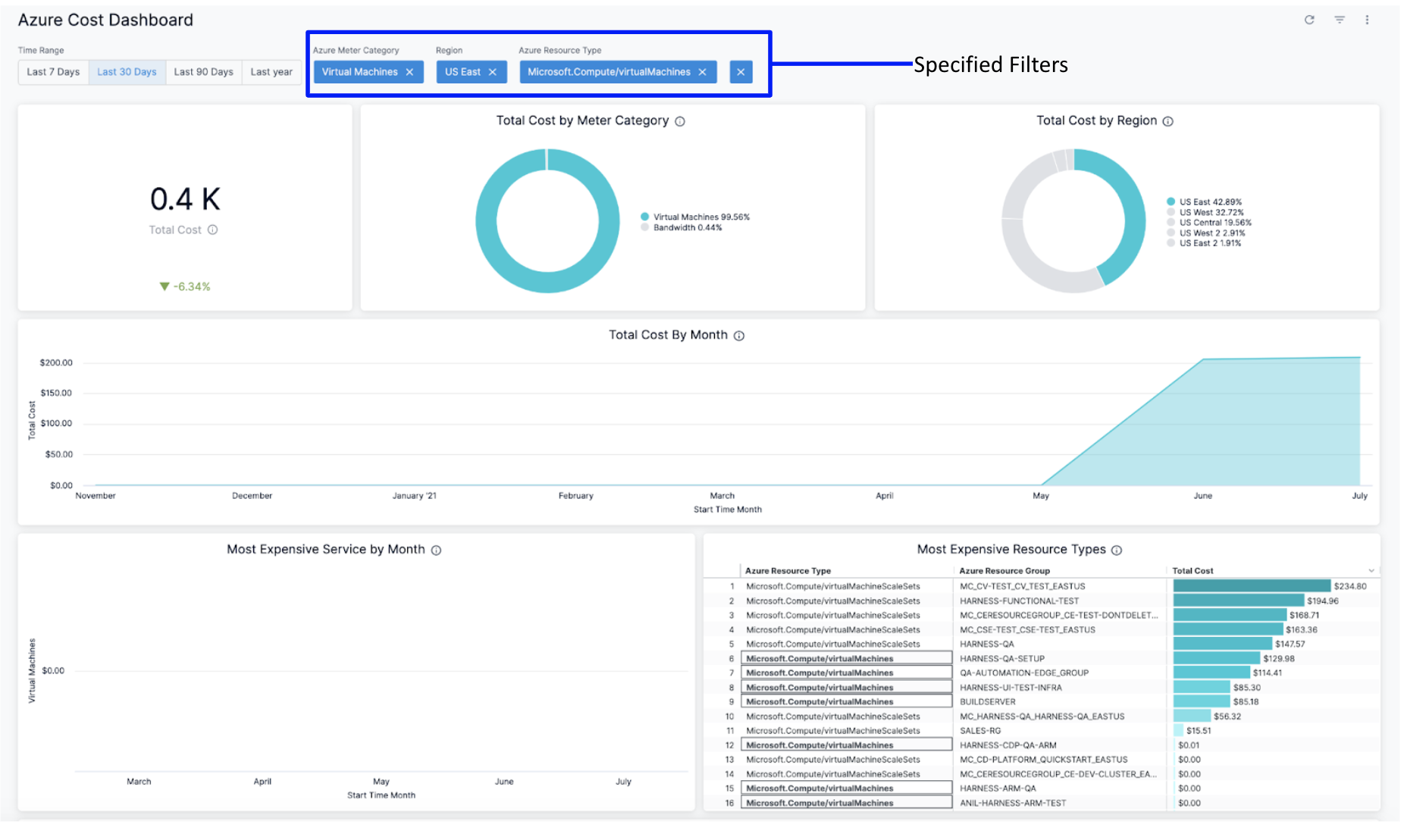 Harness provides preloaded By Harness (pre-defined) and Custom (user-defined) Dashboards to visualize cloud cost data across clusters and cloud accounts. Using the Azure Cost Dashboard you can: