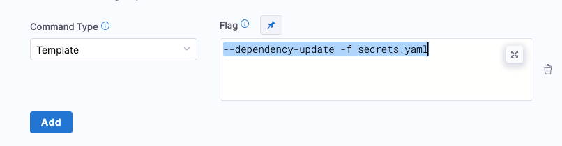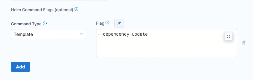 • For Kubernetes with Helm deployments (as described in this topic), configure Helm Command Flags with the Template command type and --dependency-update flag.