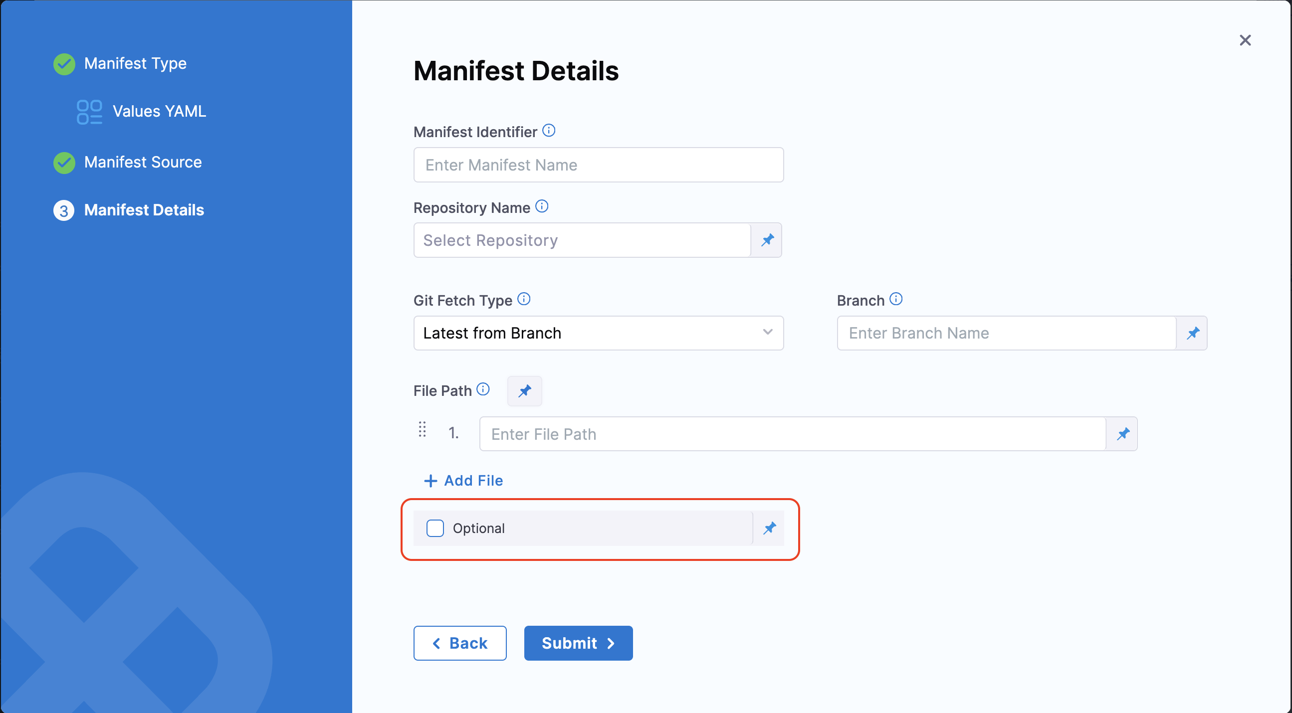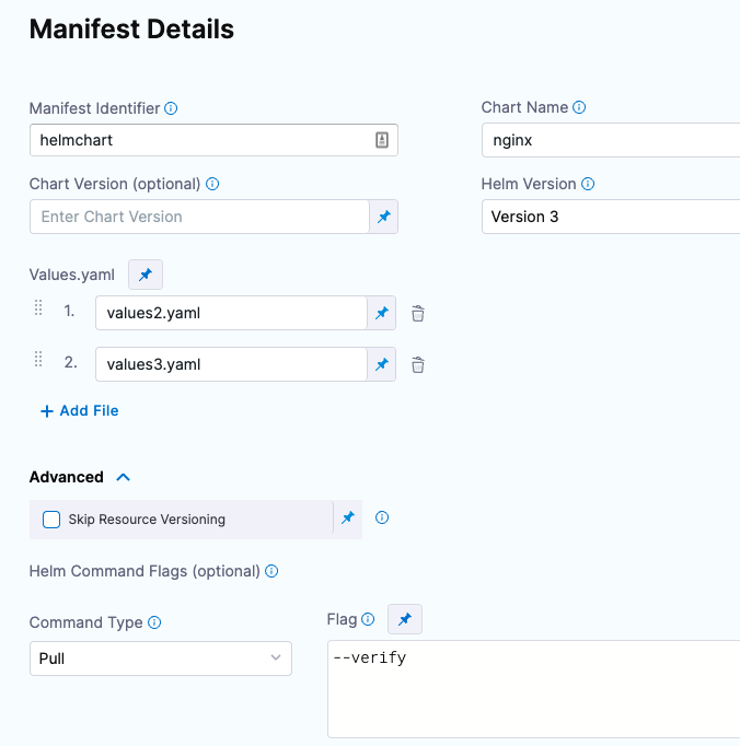 • If you want to pass in some command flags when Harness performs the --uninstall, enter uninstall in Manifest Details and enter in the relevant command flags.