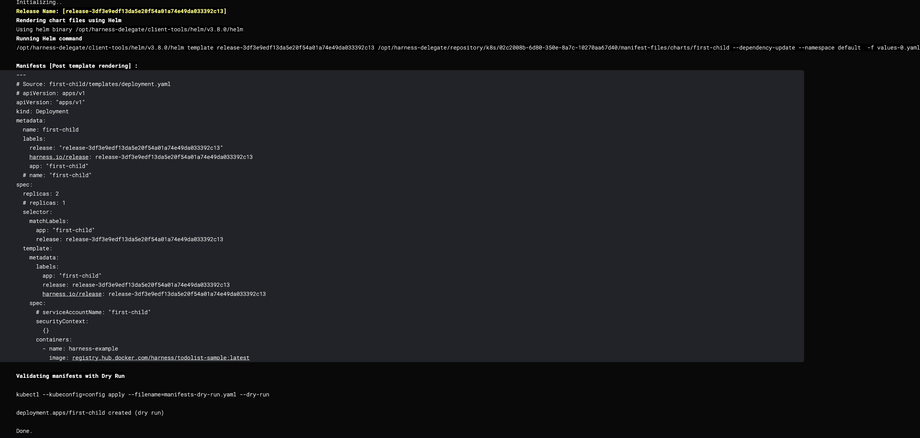 1. Based on your values.yaml and Harness configured variables, Harness will then render those values via helm template. We will consolidate all the rendered manifest into a manifest.yaml.