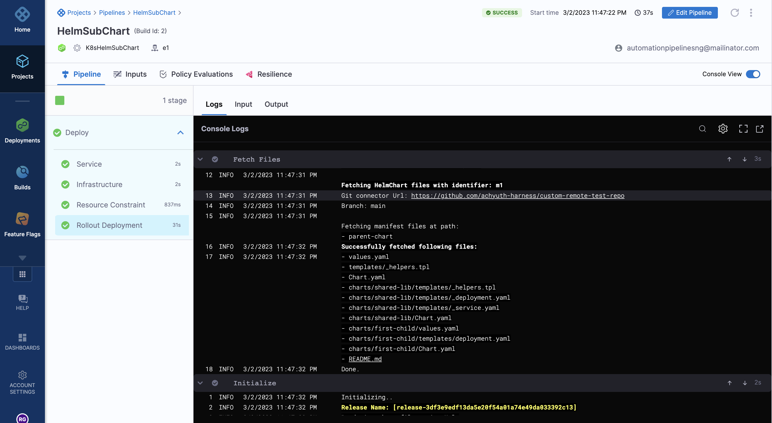 • If the deployment fails on the very first execution, then Harness will apply the --uninstall flag itself. You can see this in the logs under Wait For Steady State.