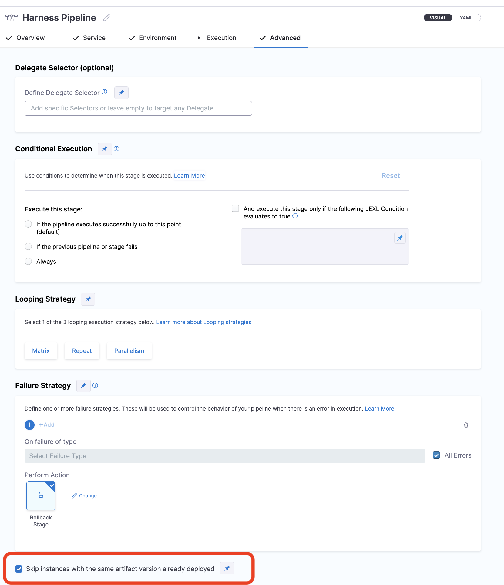 In case of stage failures in subsequent executions ((Assuming the service, environment, infrastructure didn't changed in the corresponding stage)), Harness initiates rollback to the previous successful pipeline. The previous pipeline execution must be successful for all stages. The successful stage is matched regardless of the pipeline execution status.