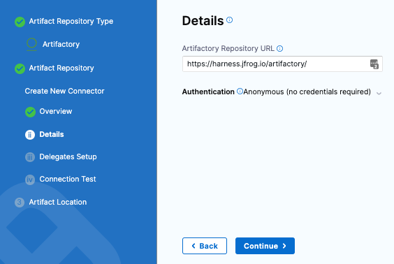 7. Select Continue to connect with Artifactory by using a Harness Delegate.