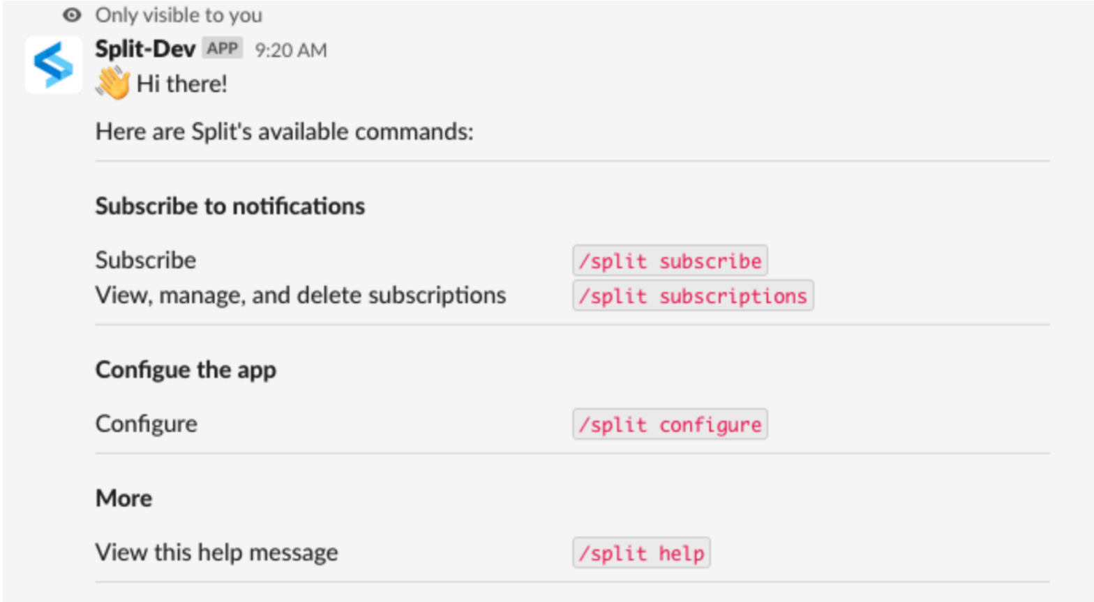 When you open Slack, a welcome message indicating that you successfully installed the Split app on the Slack workspace appears in the App’s home section: