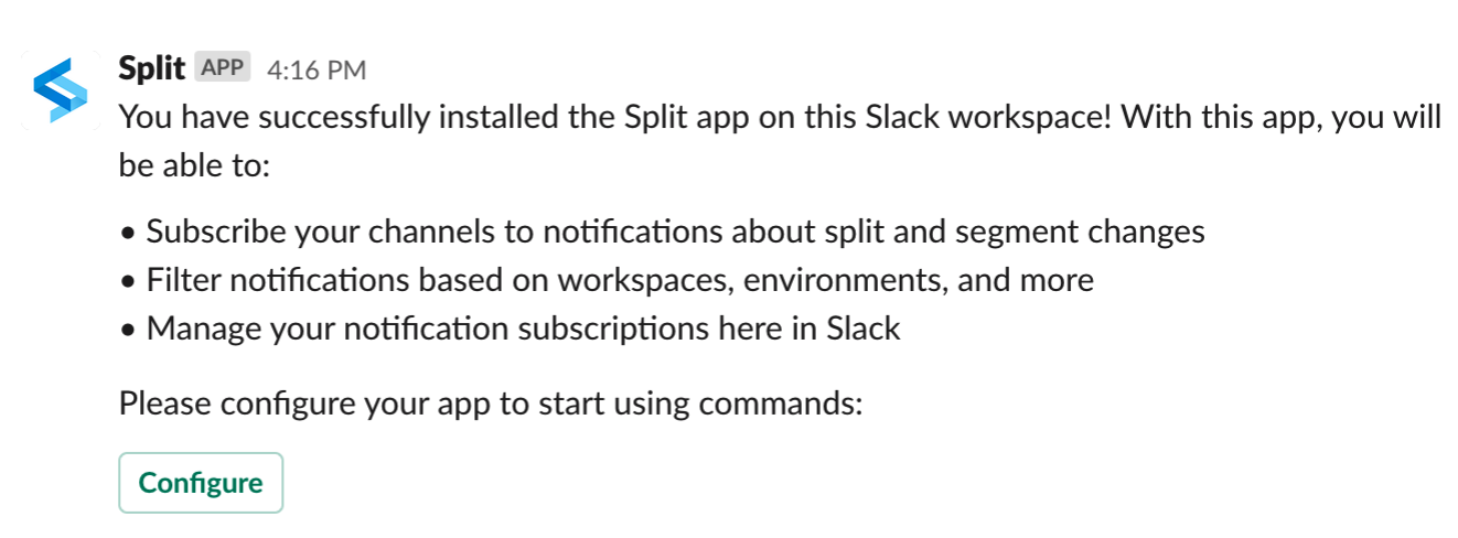 Use the /split configure command to display the Configure Split app modal. When you enter your Harness authentication token and submit it here, this links the Slack app with your Harness account. Note that you only need to use this command if you didn’t previously click the Configure button in the welcome message.