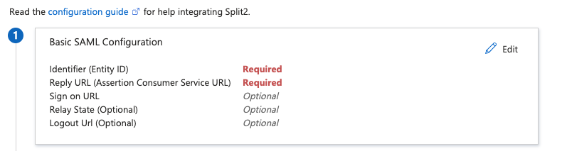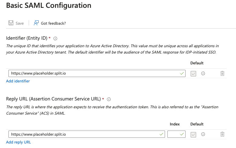 Navigate back to Azure and use the value for Assertion Consumer Service URL, provided in Split in the configuration parameters, into the Basic SAML Configuration box for Reply URL.
