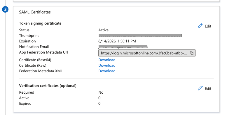 In the SAML Certificates section, click to download the SSO Federation Metadata XML. Note where you save the XML file.