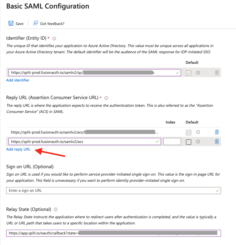 Click on Add reply URL and set the Reply URL to the Requestable SSO URL provided in Split in the configuration parameters: