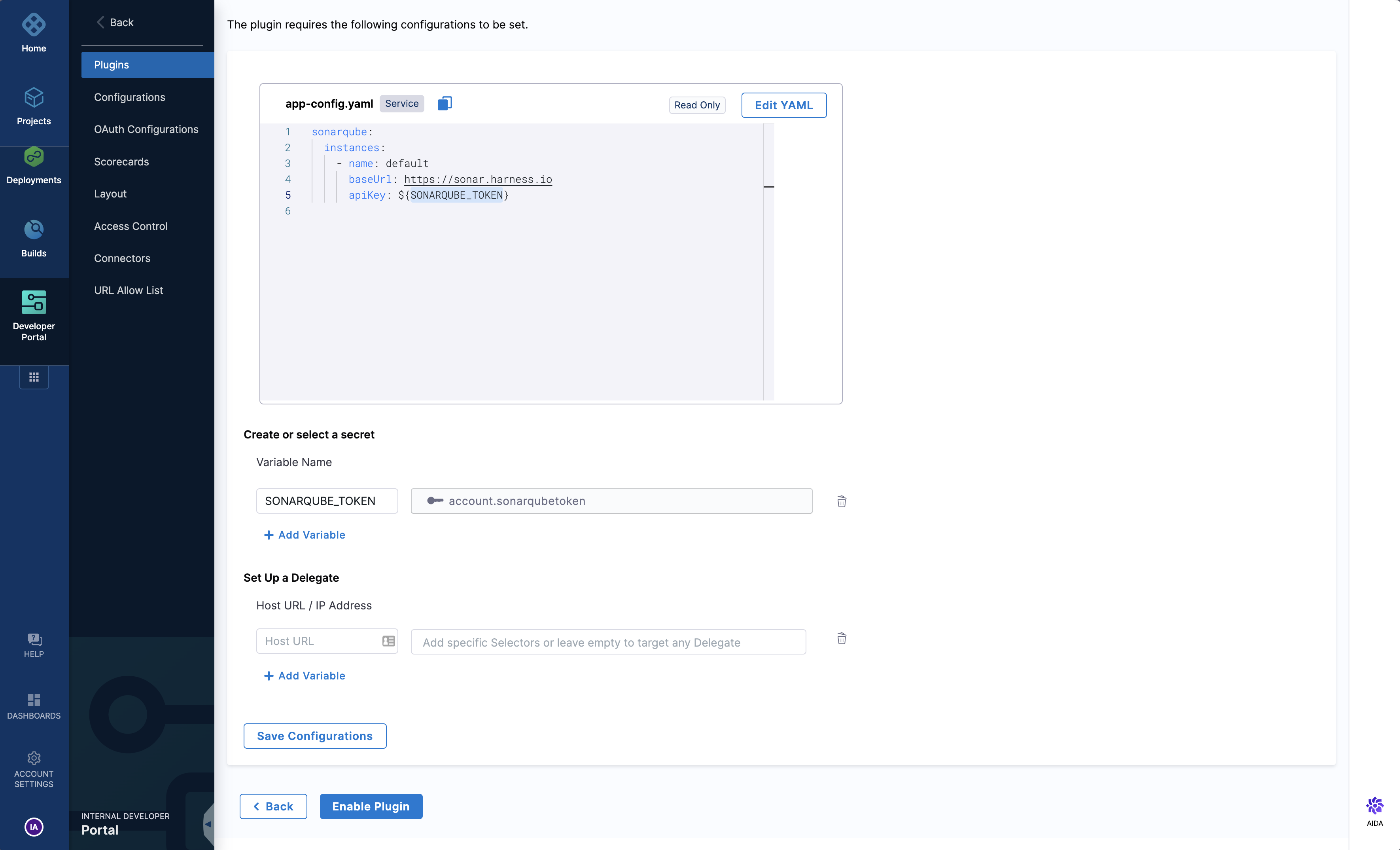 • Under the Plugins tab in Admin, go to app-config.yaml and Edit YAML to configure your SonarQube instance in the target field.