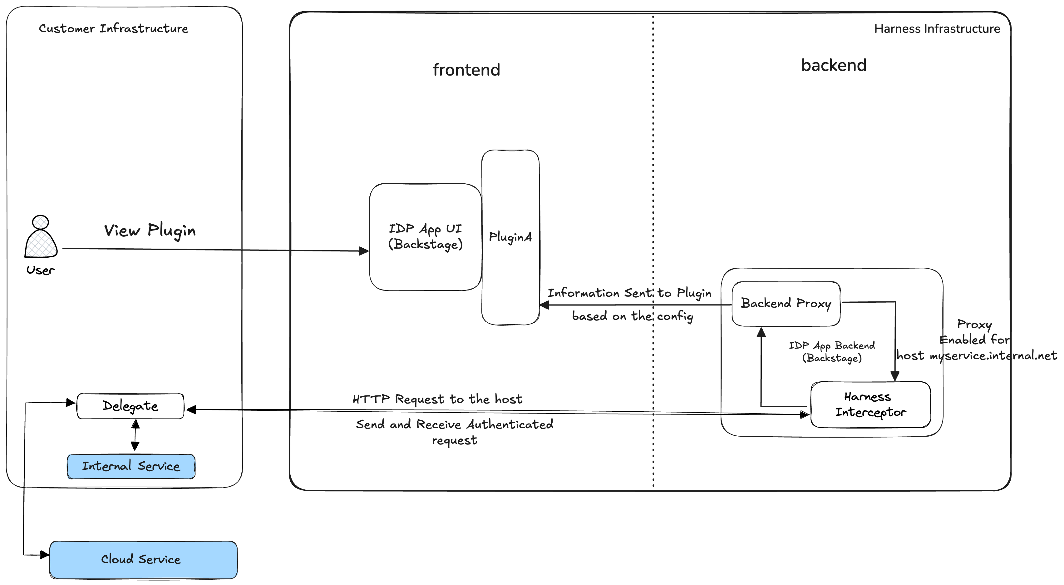 Delegate Proxy (Delegate HTTP Proxy)Delegate Proxy in IDP is an HTTP interceptor in the backend which helps plugins connect to systems which are not accessible from the Harness SaaS platform. They use a Harness Delegate which is a service you run in your local network or VPC to connect your artifacts, infrastructure, collaboration, verification, and other providers with Harness.