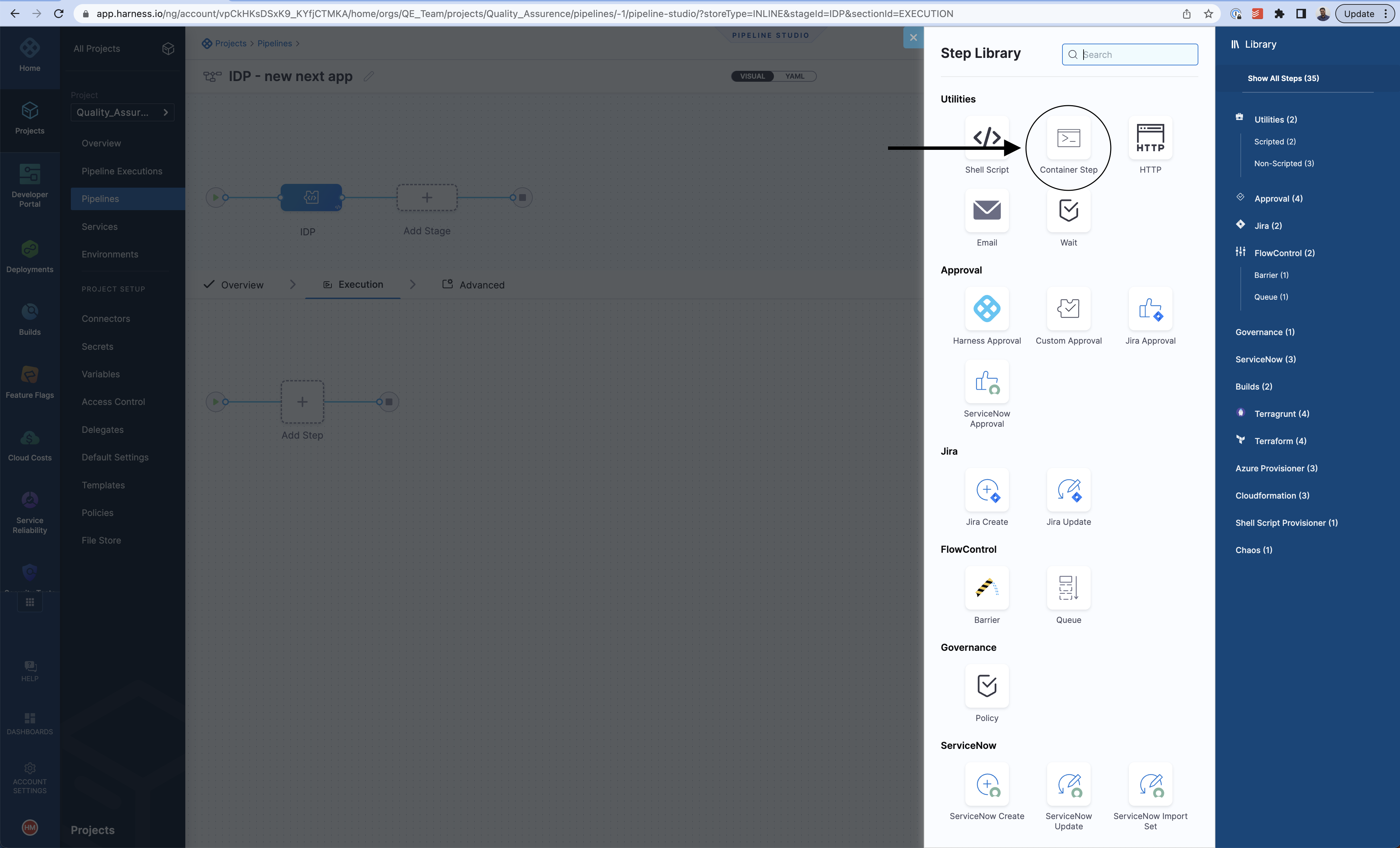 1. Select Container Step to run a Python CLI called cookiecutter. We need a publicly available Python image for this purpose. You can use Container Step for any such project generators (for example, yeoman).