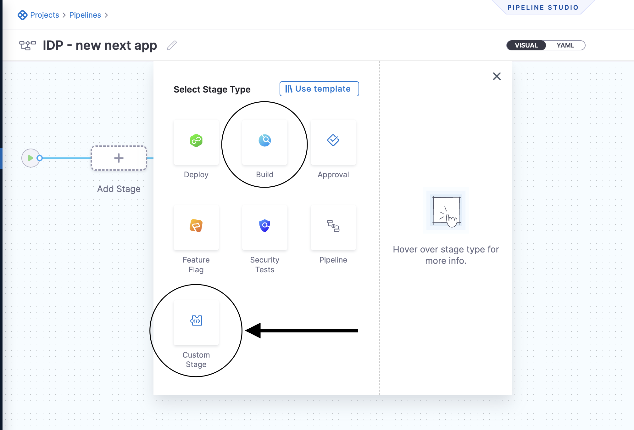 1. In Select Stage Type, select Custom Stage. (If you have a Harness CI license, you could also use the Build stage type. However, for this tutorial, we recommend that you use the Custom Stage type.)