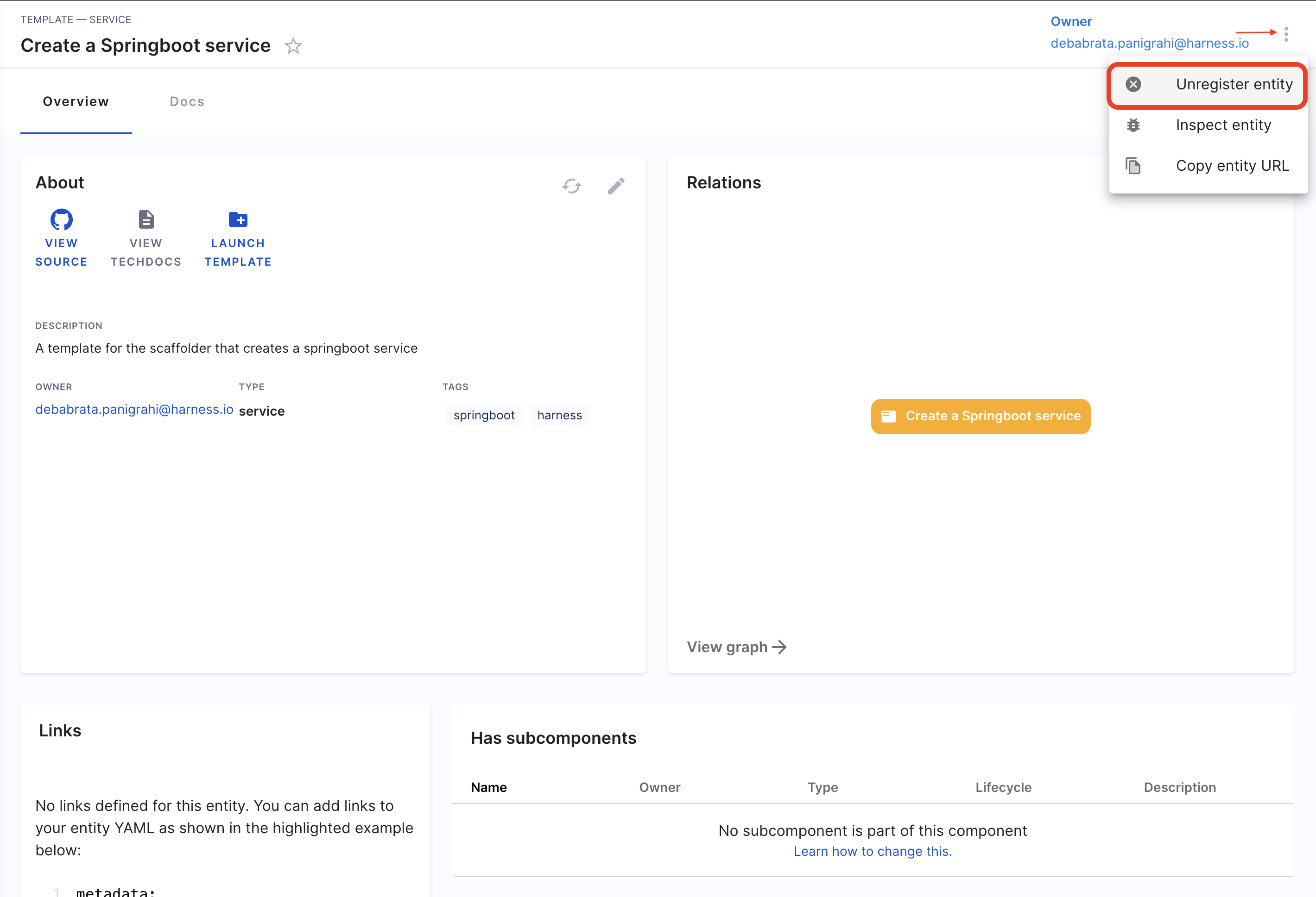 2. Now on the Template overview page, click on the 3 dots on top right corner and select Unregister Entity.