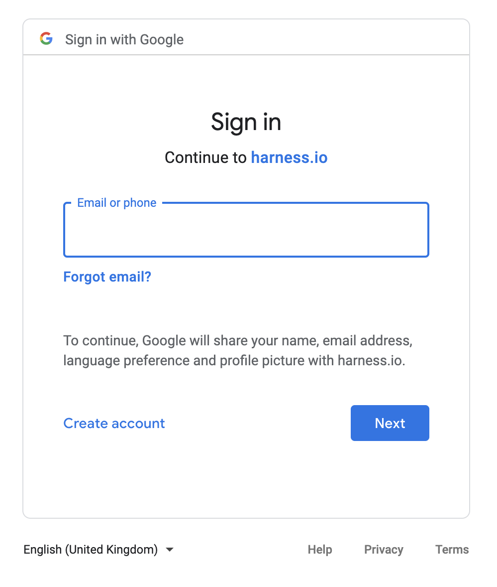 For all future logins, if you are already logged into your OAuth 2.0 provider in the same browser as Harness, simply enter your email address in Harness and log in automatically.