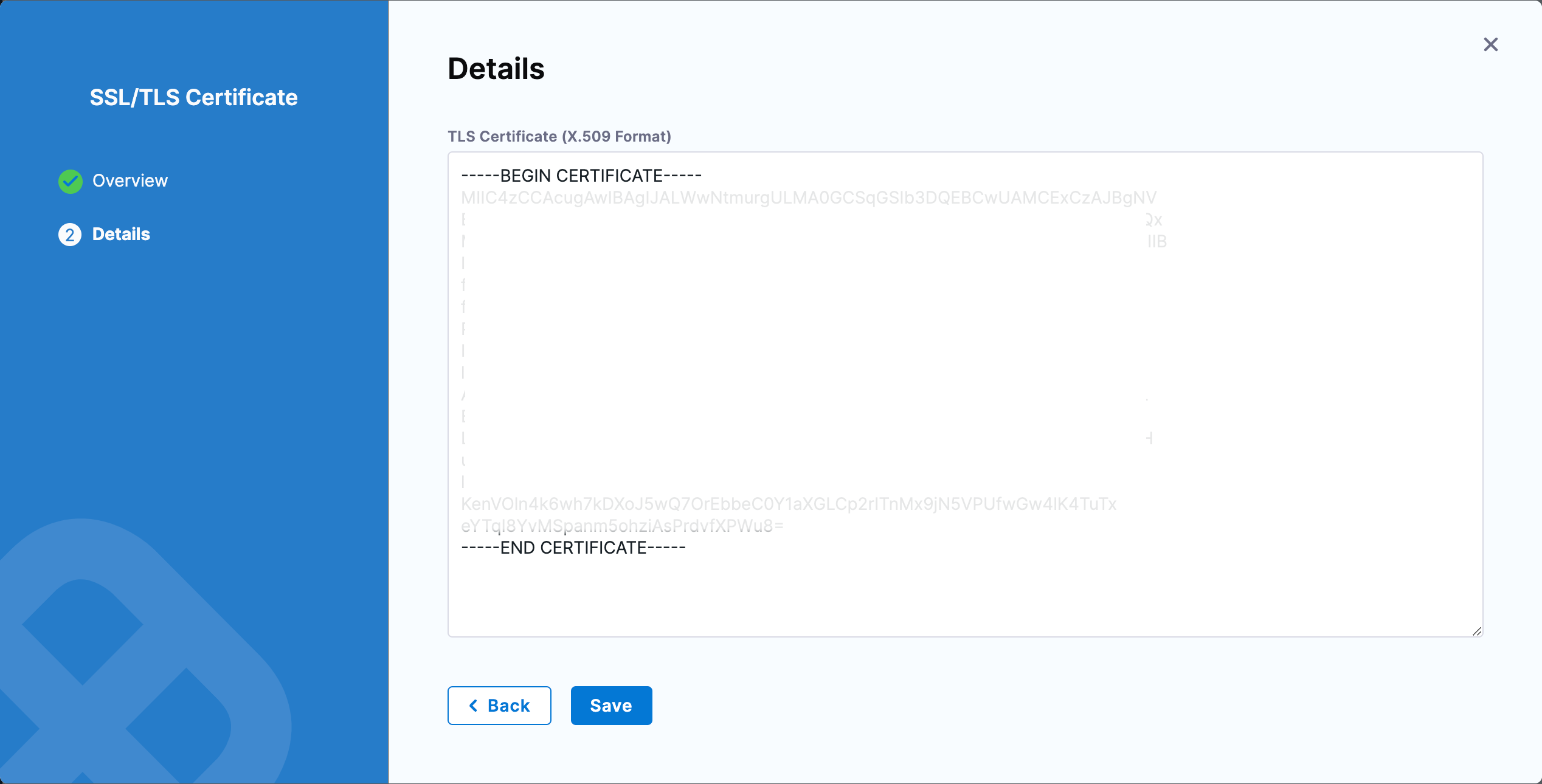 6. Input the TLS Certificate in the X.509 Format. This section also provides the option to chain multiple certificates, offering enhanced flexibility for certificate management. Ensure that the certificate details are correctly entered and conform to the X.509 standard.