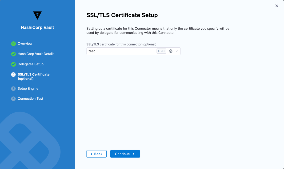 You can add a certificate to a HashiCorp Vault connector at the account, organization, or project scope.