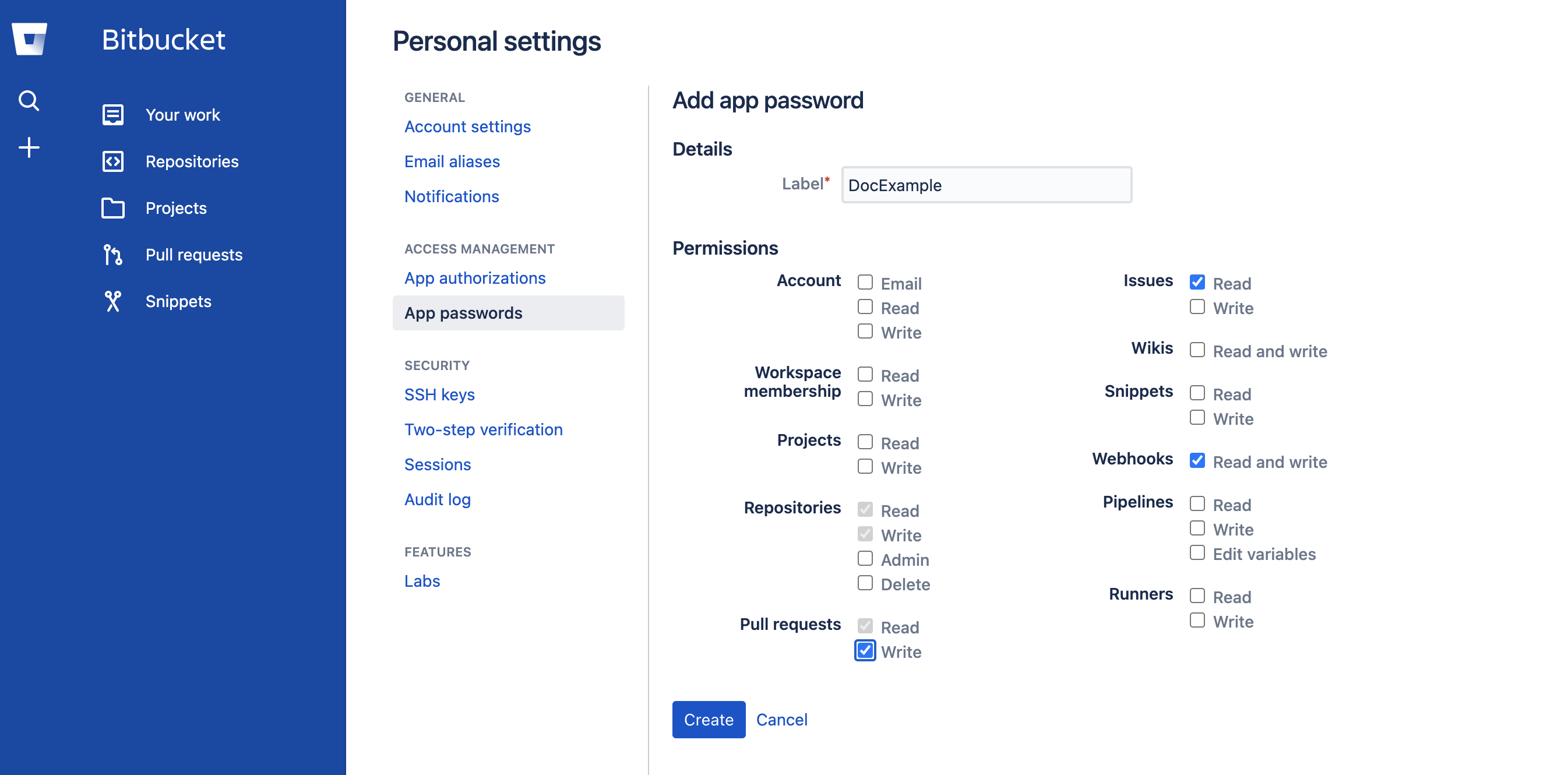 • Username and Password. This is the Bitbucket username and App password in your Bitbucket account settings.