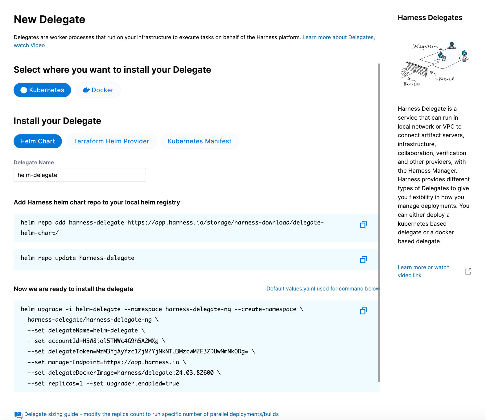 Now we are ready to install the delegate. The following example installs/upgrades firstk8sdel delegate (which is a Kubernetes workload) in the harness-delegate-ng namespace using the harness-delegate/harness-delegate-ng Helm chart.
