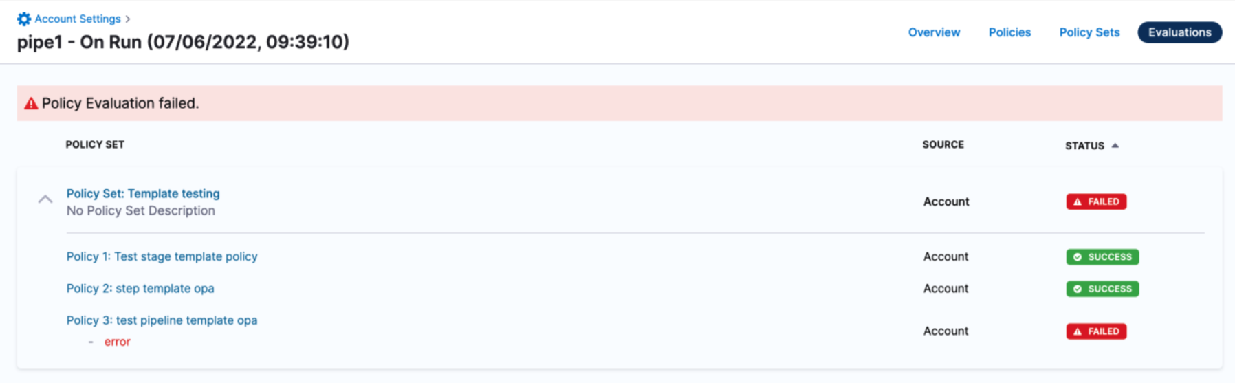In some cases, you might have an enabled Policy Set and need to disable it. For example, if a Policy Set is enabled and an unintended Pipeline or other resource does not pass the Policy Set's evaluation, you will receive a failure, like this: