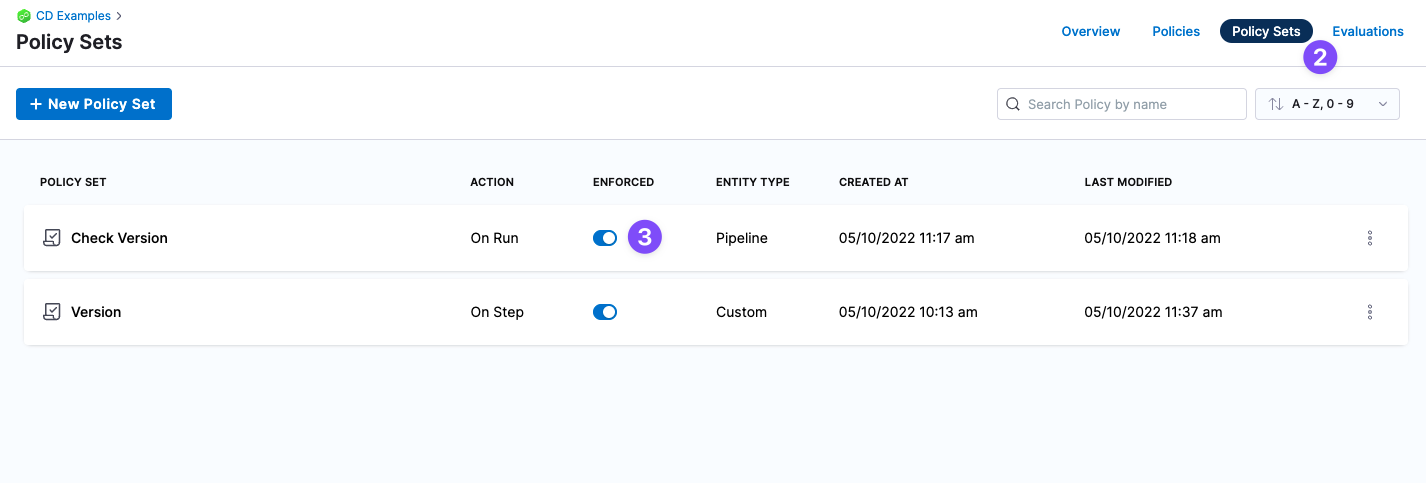 By default, a new Harness Policy Set is disabled. This default prevents someone from enforcing a Policy Set and accidentally impacting Pipelines and other Harness resources.
