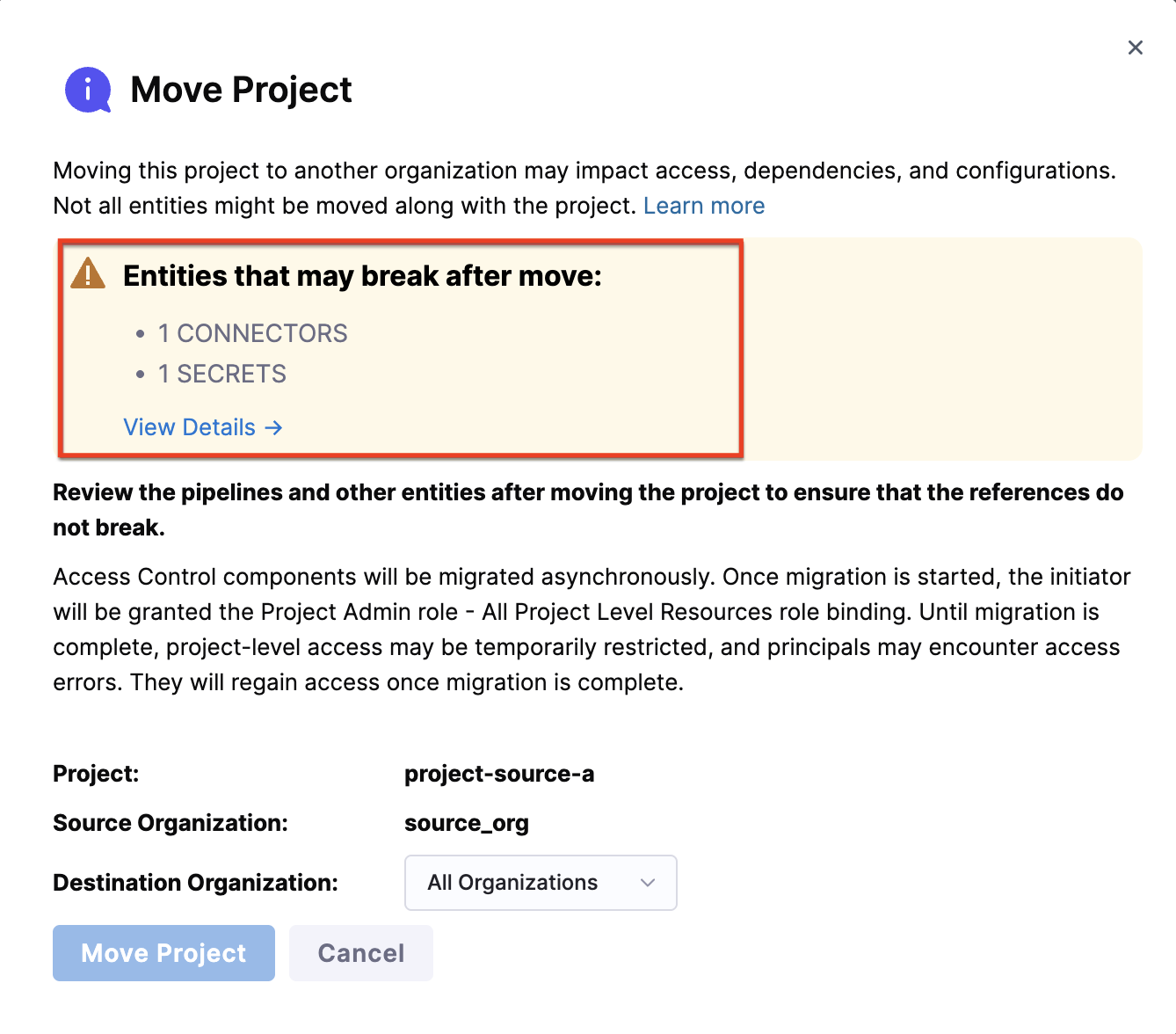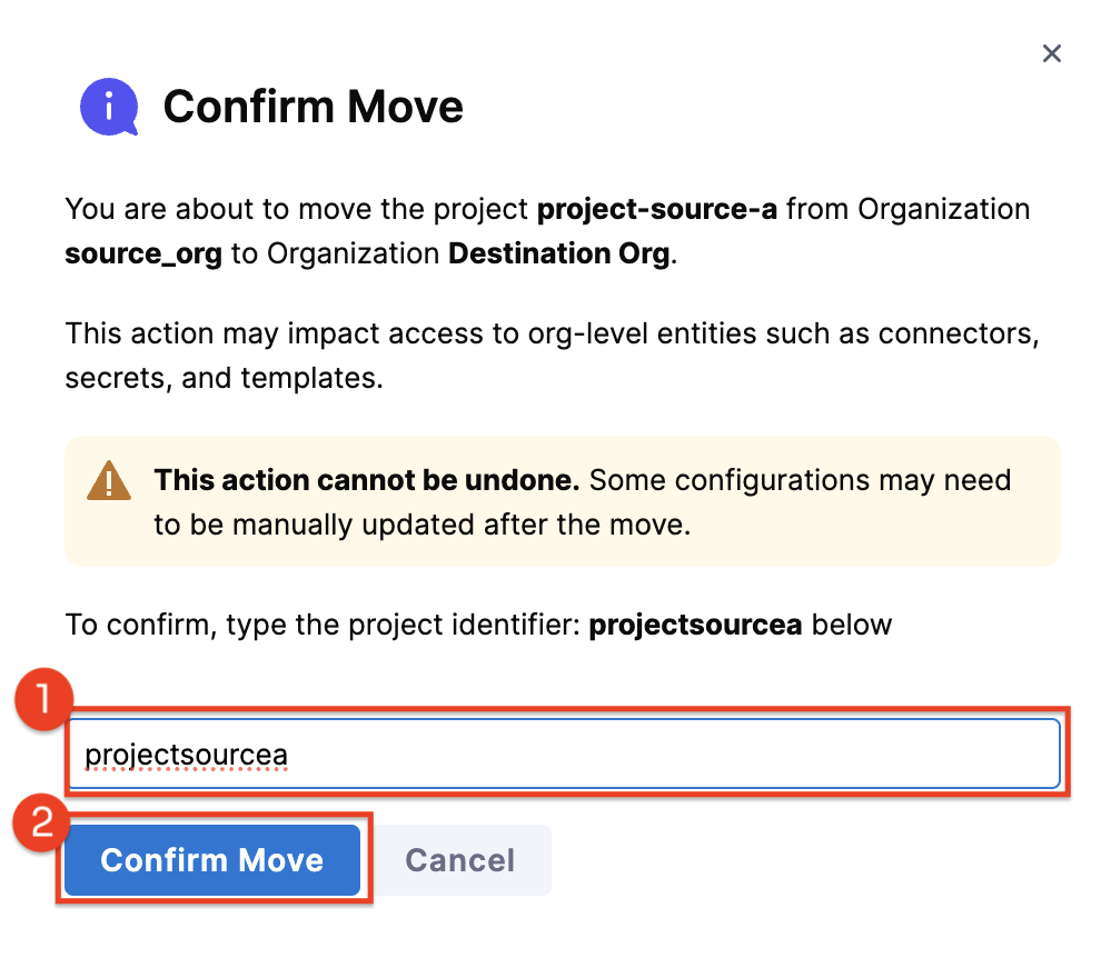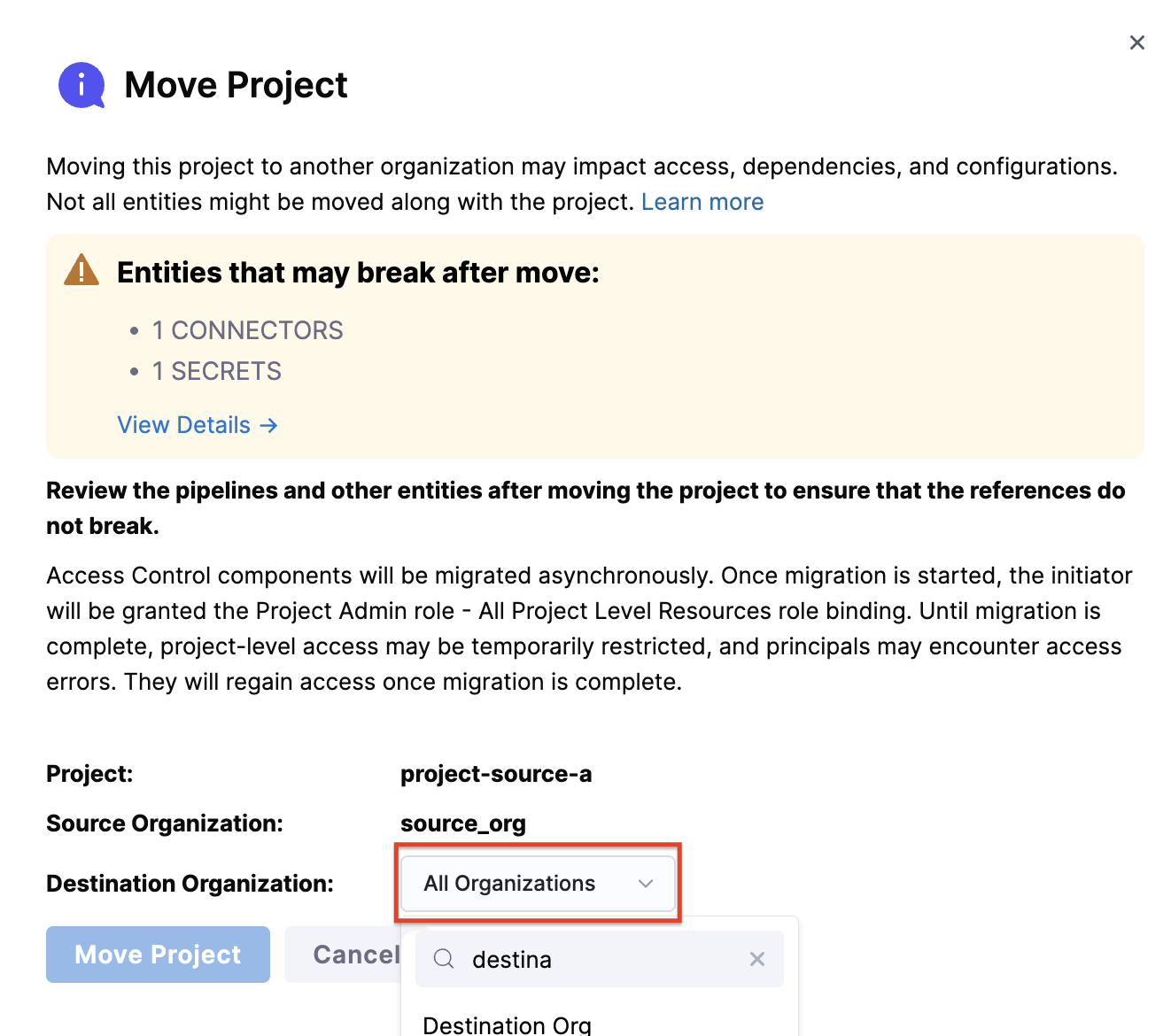 Select the destination organization from the dropdown where you want to move the selected project. Note that only organizations where you have create project permission are listed in the dropdown.