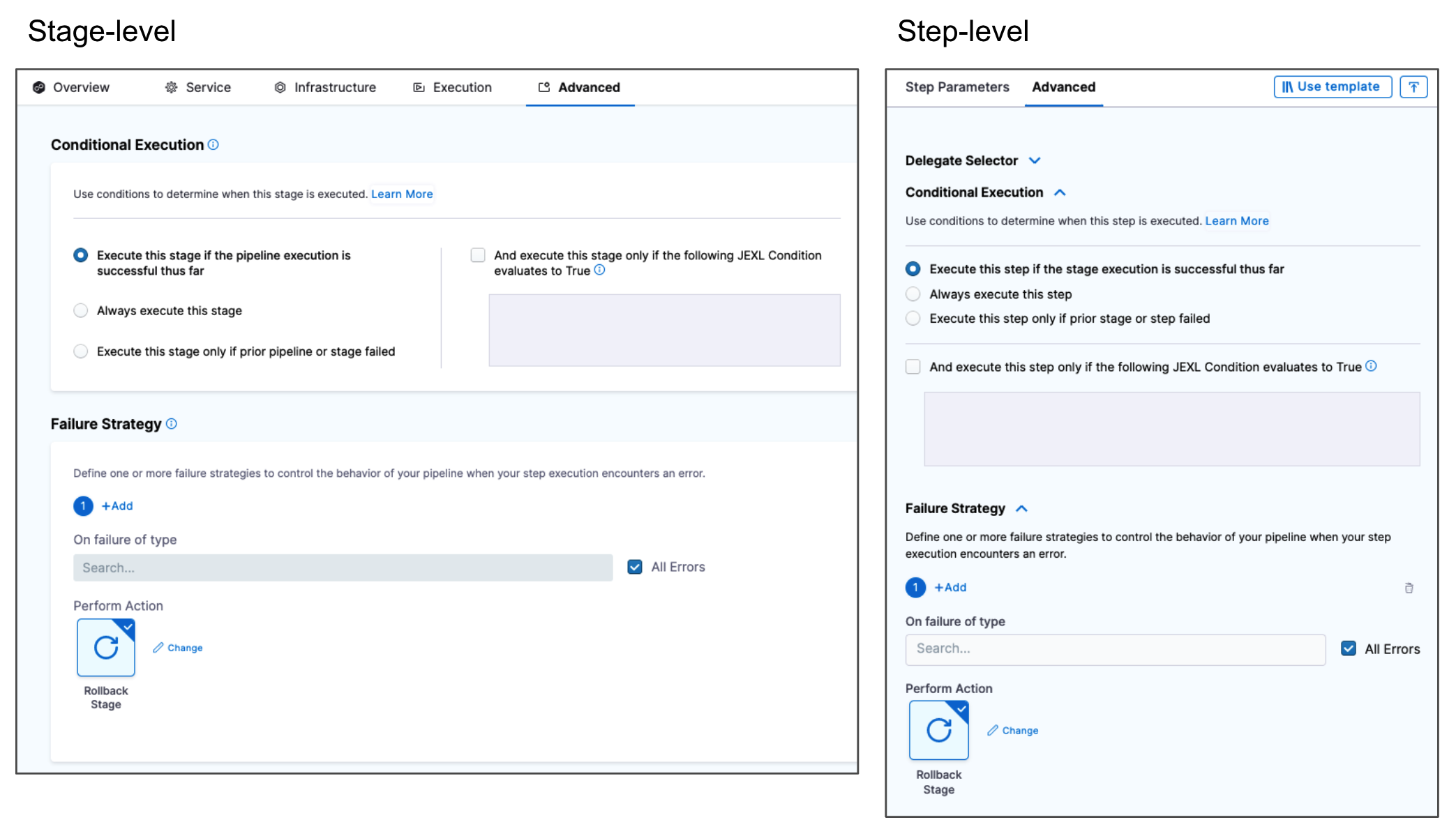 - Stages: A stage failure strategy applies to all steps and step groups in the stage that don't have step-level failure strategies.