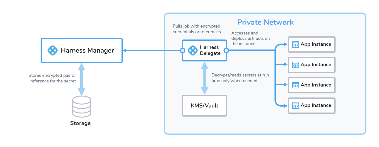 - Harness Manager does not have access to your key management system, and only the Harness Delegate, which sits in your private network, has access to it. Harness never makes secret management accessible publicly. This adds an important layer of security.