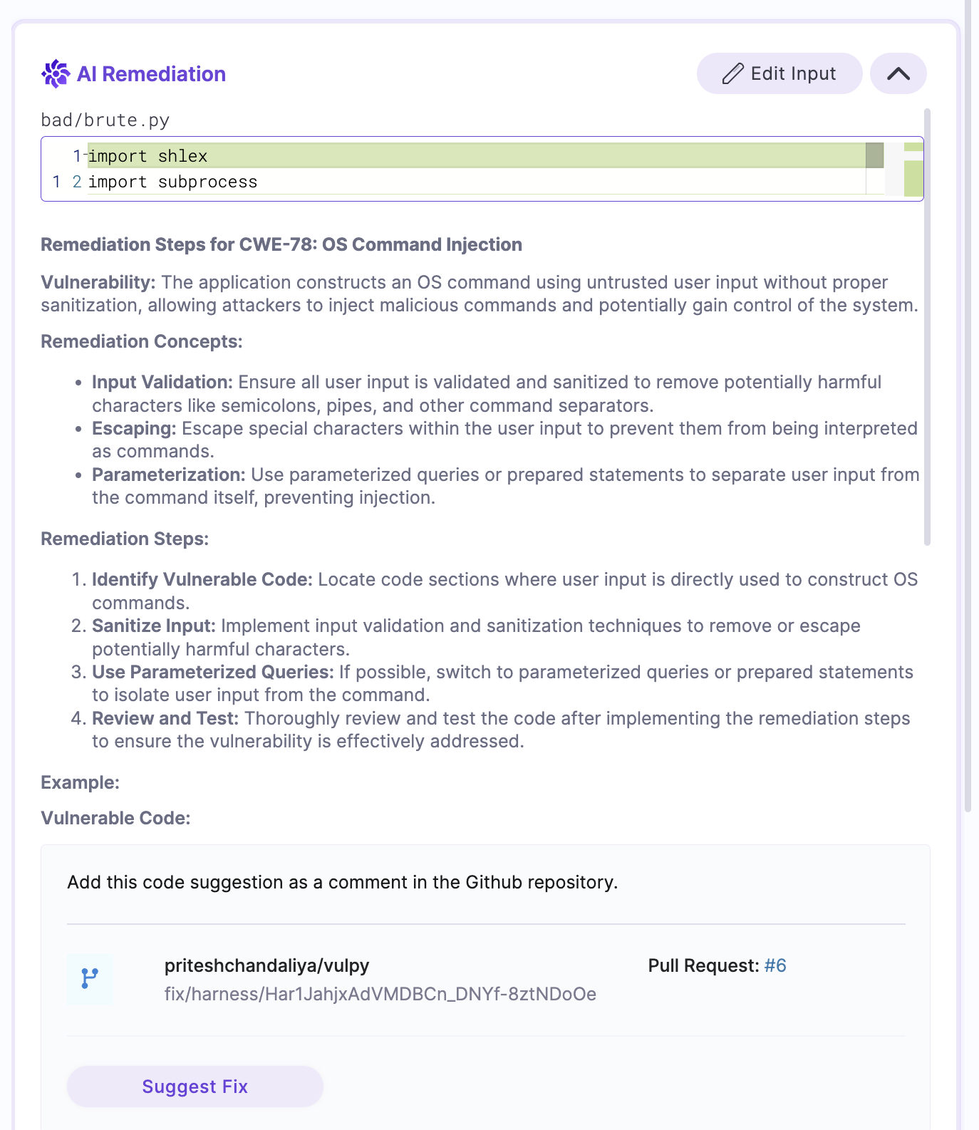 Some scanners provide details on the location of the vulnerable code, such as the file name and line number, but may not offer the specific code snippet itself. With the Edit Input option, you can copy and paste the exact vulnerable code snippet. Harness AI will then use this information to recommend code changes, which can be used to create a pull request or make a code suggestion.