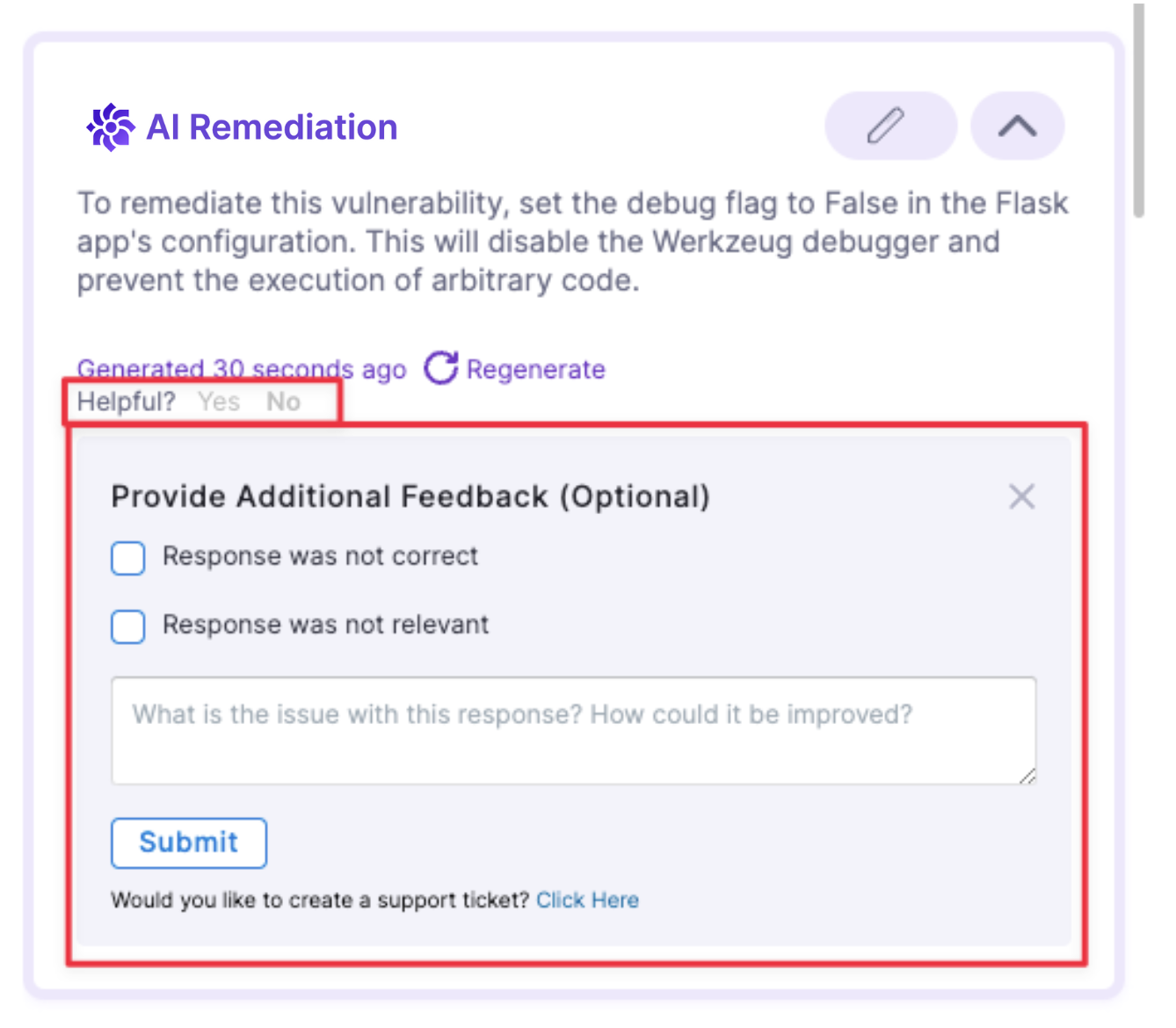 You can send feedback to Harness about a specific remediation. Under Helpful?, click No. Then enter in your feedback and choose Submit.