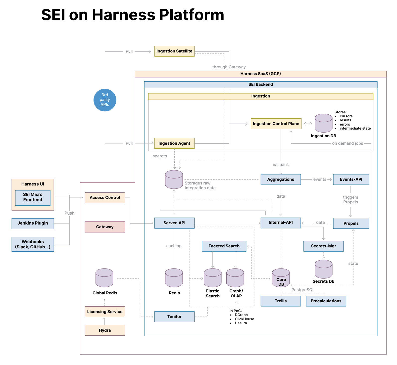 The diagram illustrates the architecture of the Harness Software Engineering Insights (SEI) module on the Harness platform, providing an overview of its key components and how data flows through the system.