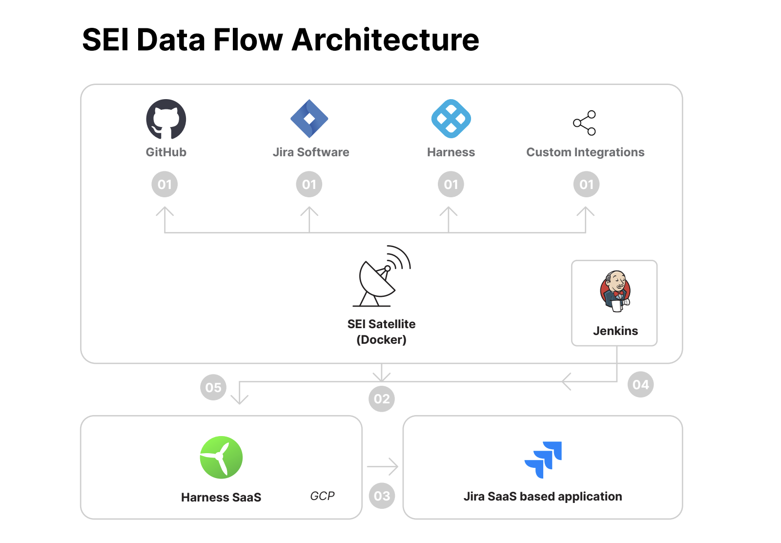 • Jenkins integration: The Harness SEI Jenkins Plugin is installed on the user’s Jenkins server. This plugin securely connects outbound to the Harness SEI SaaS application, allowing licensed users to access the SEI UI portal via secure transport.