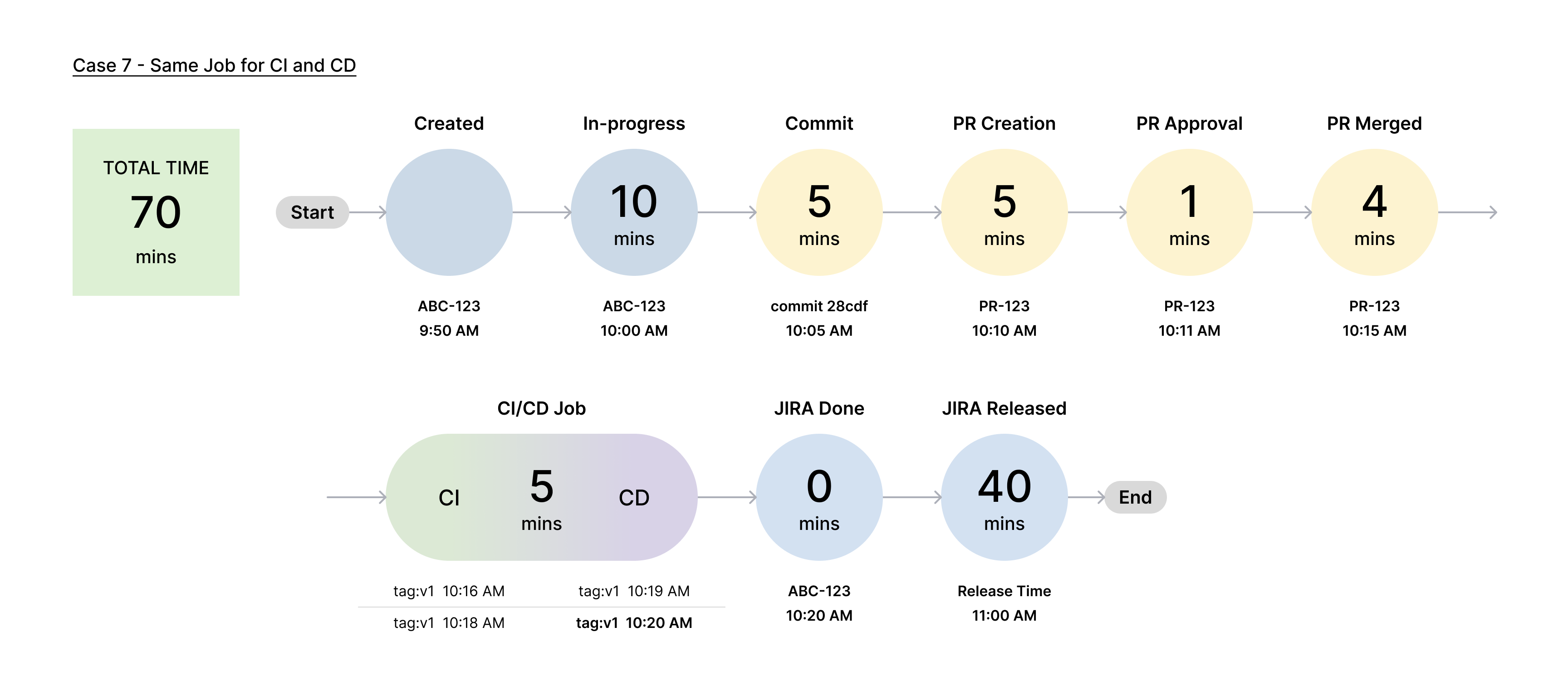 In this case, a single job handles both the CI and CD processes, so the First CI and CD Completion Time stage represents the time taken for this single job to complete both processes. The First Issue Management Done Time is zero because the issue is marked as Done immediately after the CI and CD processes are completed by this single job.