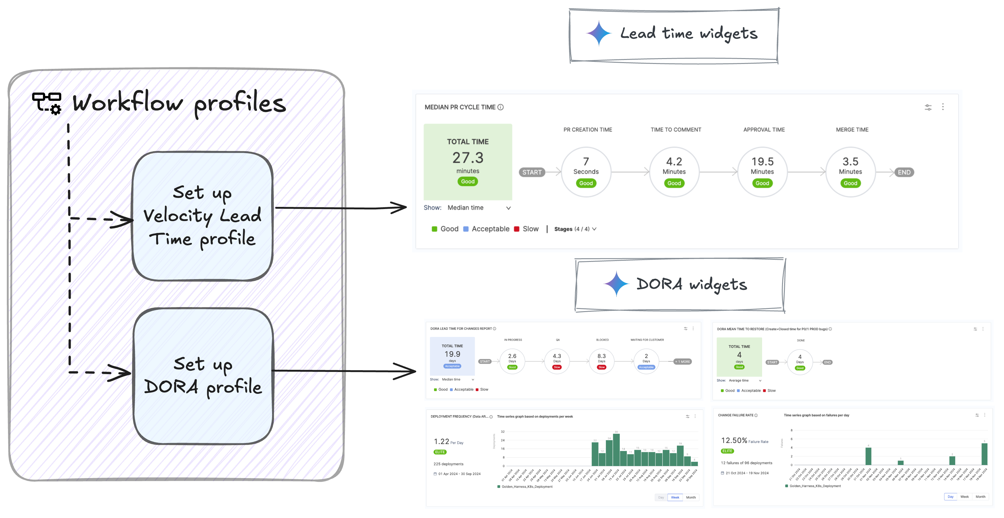The primary difference between the two profiles lies in their scope. DORA profiles define metrics for DORA widgets, while Velocity profiles are used in all other lead time-related widgets.